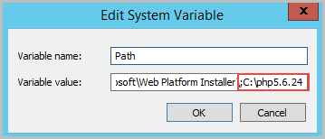 Add a semi-colon (;) at the end of the line and add the full system path of the PHP installation: C:\php5.6.X. Click on OK on all the dialogs to close them.