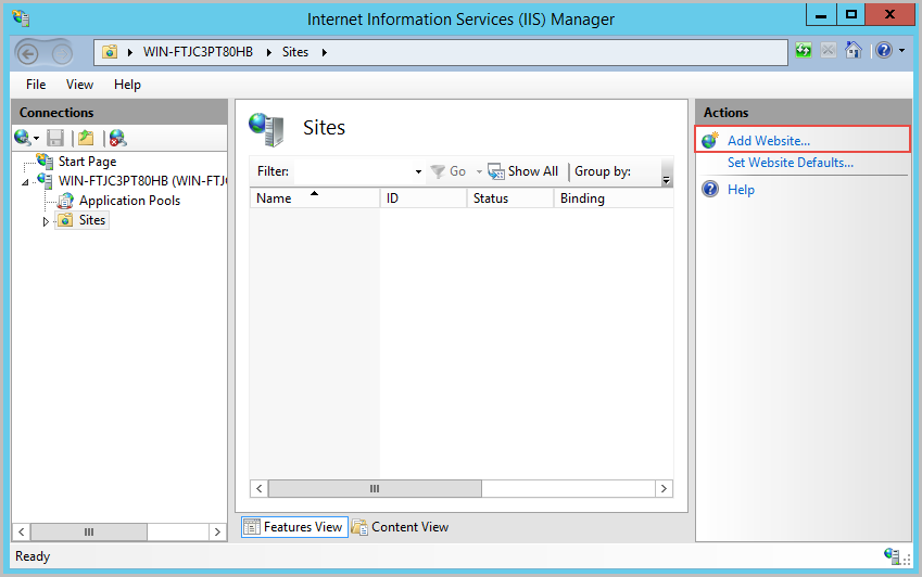 Open the Internet Information Services (IIS) Manager once again, go to Sites at the right side menu and remove the Default Web Site.