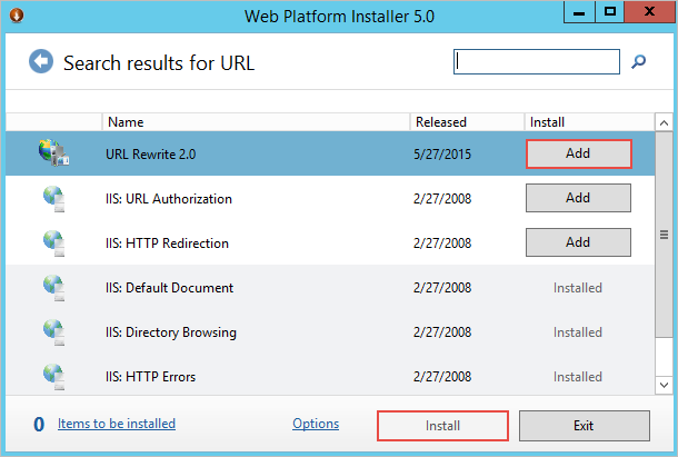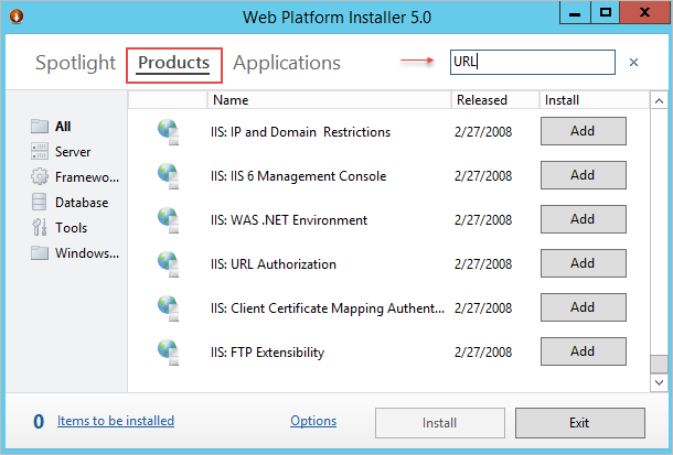 Once the installation has been completed, open the Web Platform Installer and go to the Products tab. In the search box enter "URL Rewrite" and press Enter.