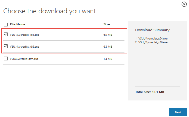 Select the vcredist_x64 or vcredist_x86 file (depending on your system) and click on the Next button at the right-corner of the dialog screen. The download process of the file will begin automatically.