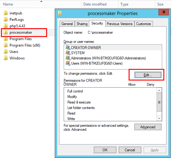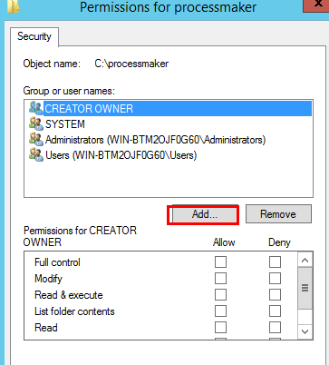 Set the corresponding permissions to the ProcessMaker file in C:\processmaker by right clicking on it and going to "Properties > Security > Edit".