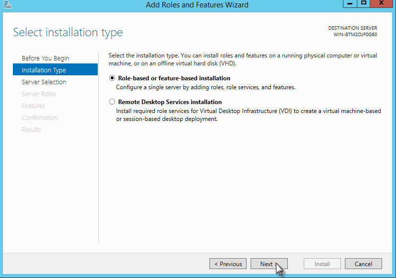 In the next window, go to step Installation Type and select Role-based feature-based installation. Then, click on Next.