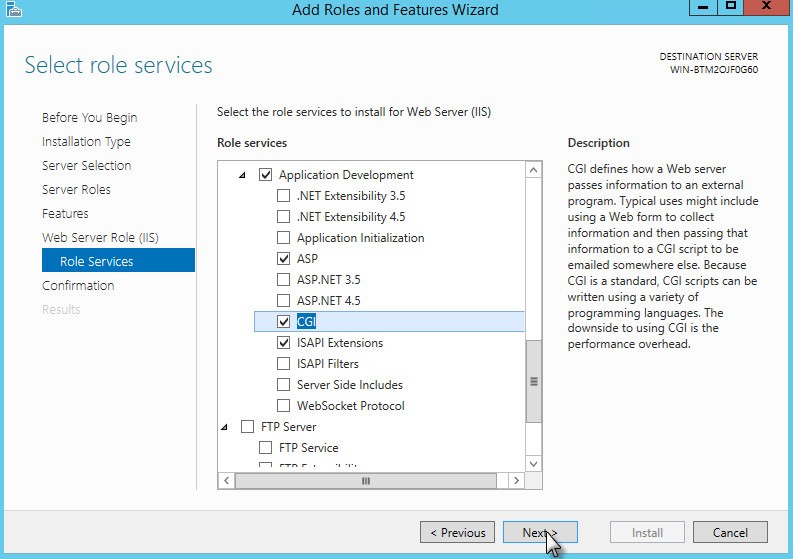Now, in the "Role Services" dialog, scroll down and select the Application Development option. Expand its options by clicking on the arrow and from the list that is displayed, select the options ASP, CGI, and ISAPI Extensions as shown in the image below. Once done, click on Next.