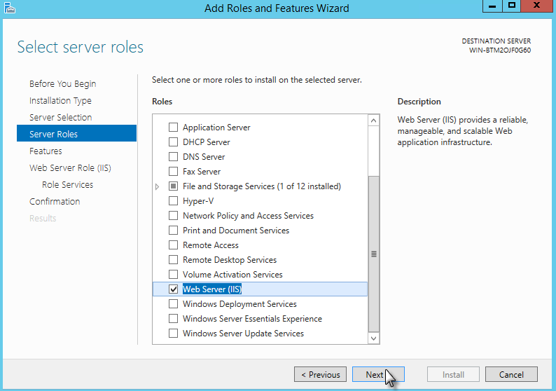 In the "Server Roles" dialog, check the option Web Server (IIS).