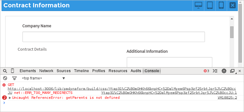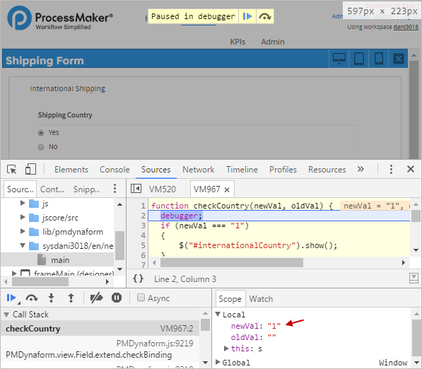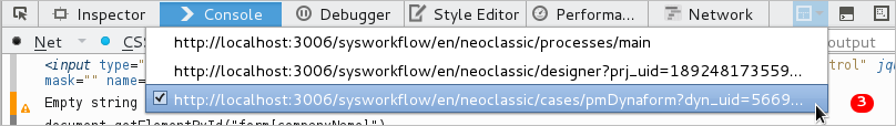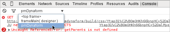 dropdown box in the Debugger toolbar and select the iframe which holds the Dynaform. If in preview mode, it will be found at the address http://address/sysworkspace/skin/cases/pmDynaform?dyn_uid=dynaform-id.