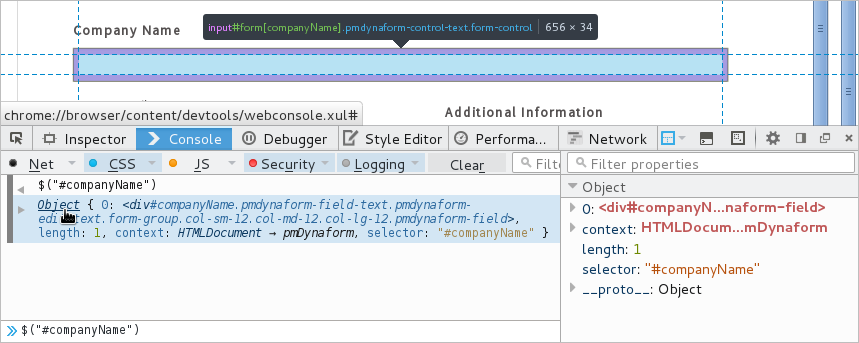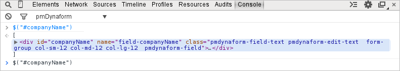 Once the Dynaform's iframe is selected, then JavaScript commands can be entered in the bottom of the console at the >> prompt. Press ENTER to execute the command. Any results from the command will be displayed in the console. For example, entering $("#companyName") displays the content of the object in the console: