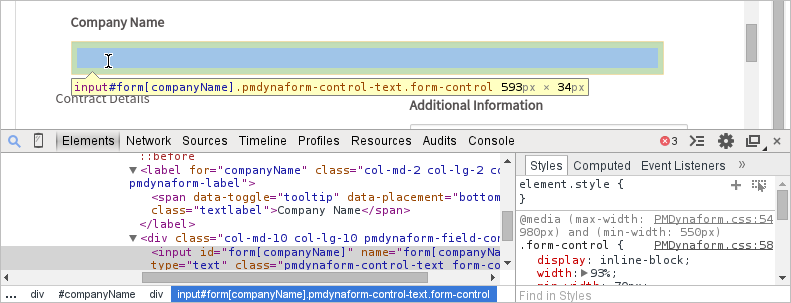 icon in the upper right corner of the Debugger to activate the Inspector and then click on an element in the Dynaform to select it. The Debugger will display spacing information on the screen around the element. In the Inspector tab, it will display the element's HTML code in the bottom left-hand panel and its CSS code inside the right-hand panel. The HTML and CSS code can be dynamically edited inside the Debugger to immediately see changes on the screen.