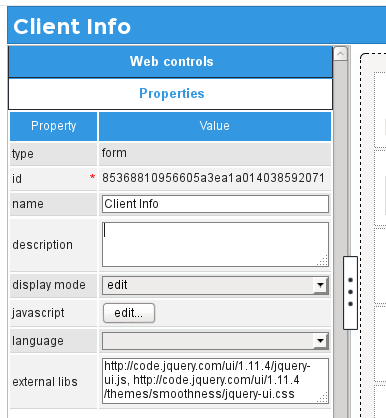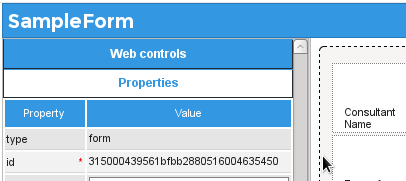 To add JavaScript to a Dynaform, first open the Dynaform for editing. Then click on the light blue border of the Dynaform (which is the space outside the controls) to display the properties of the Dynaform.