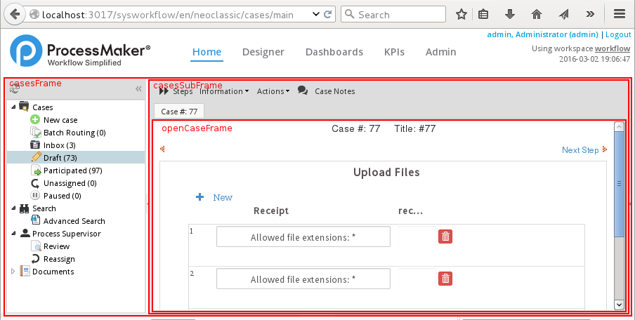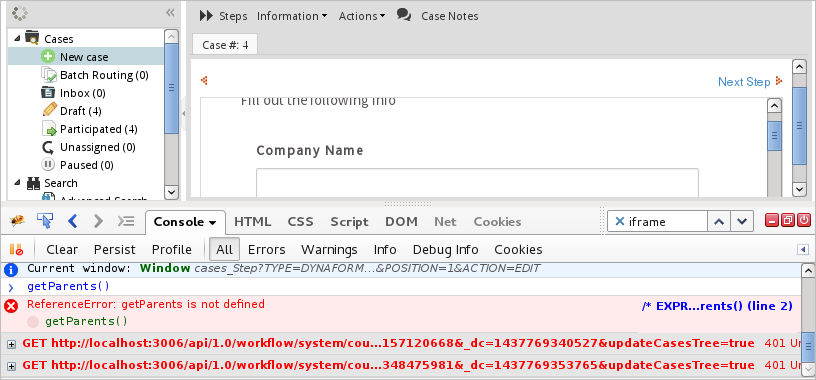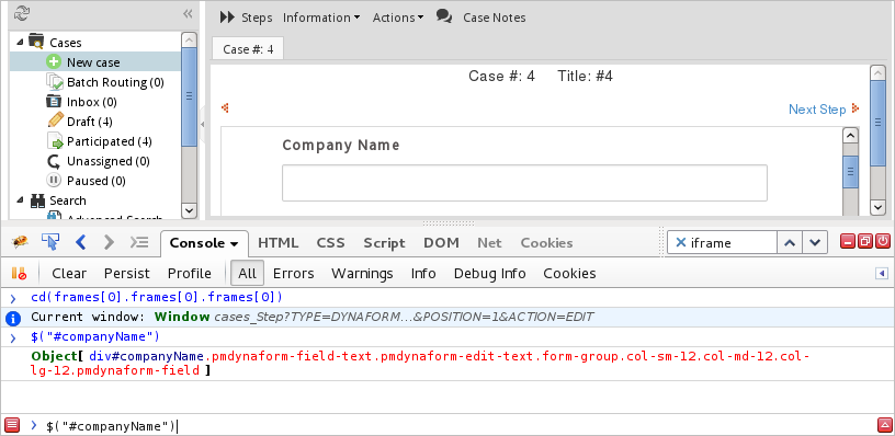 When debugging JavaScript code, it is often useful to display the contents of variables and execute JavaScript commands interactively in the console (in Chrome Developer Tools, Firefox Debugger, Firebug, Internet Explorer Developer Tools, etc.) When in preview mode, a Dynaform is placed inside an <iframe> with no ID whose src="cases/pmDynaform?dyn_uid=dynaform-id". When running a case, the Dynaform is placed inside an <iframe> with the ID "openCaseFrame" whose src="cases_Open?APP_UID=case-uid&DEL_INDEX=delegation-index&action=draft".