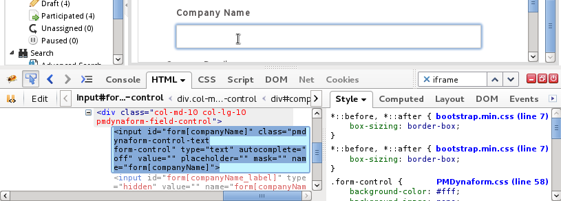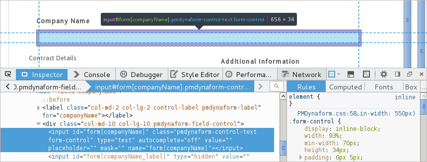 Firebug can also be used to examine the HTML and CSS code for a particular element in a Dynaform, which is useful if needing to discover the IDs of elements or the structure of the DIVs. To inspect an element, click on the