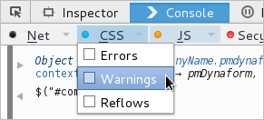 It is a good idea to only show JavaScript errors and warnings. Click on the down arrow next to the CSS tab and unmark all the options to show Errors, Warnings and Reflows.