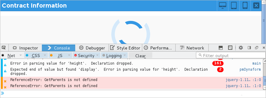 If the error lies in code that is executed later when an event occurs, then the Dynaform will be displayed, but the JavaScript code will not be executed and nothing will appear to happen. By default most web browsers are configured to not display error messages, so it won't be obvious that an error has occurred until you check the JavaScript error messages. See the instructions below to configure Firefox, Chrome and Internet Explorer to display JavaScript errors and use the console to interactively enter JavaScript code.