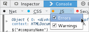 Then click on the down arrow next to the JS tab and mark the options to show Errors and Warnings.