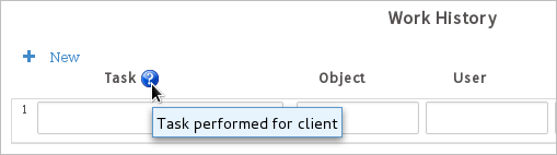 A grid with the ID "workHistory" lists the tasks performed for a client. The grid contains a field with the label "Task". The following JavaScript code adds the tooltip message "Task performed for client" to the "Task" header. It also inserts an