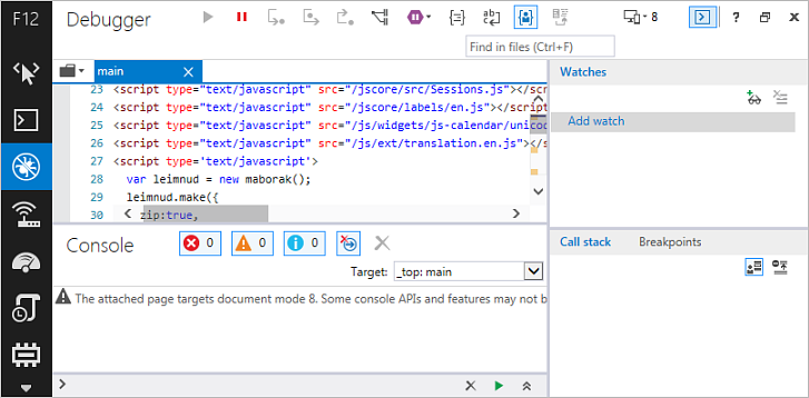 Internet Explorer 11 and Microsoft Edge offers Developer Tools, which can be used to debug JavaScript code.