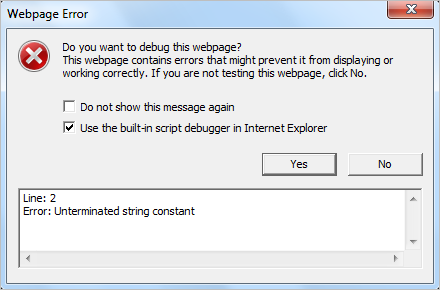 If the browser detects a JavaScript error, a warning message window with a red icon will be displayed. Check the "Use the built-in script debugger" option and review the JavaScript error message; then click on "Yes" to open the debugger.