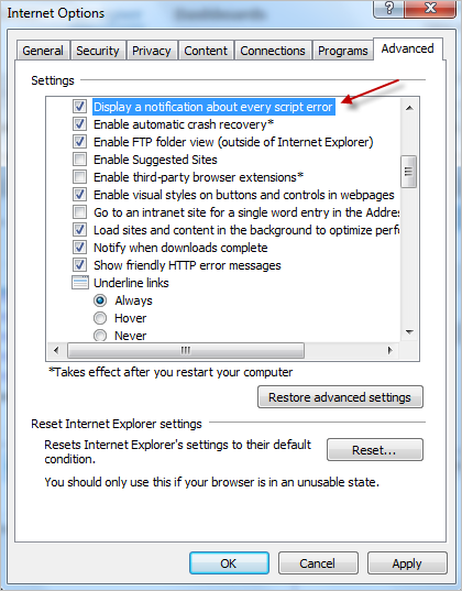When debugging code, it is a good idea to adjust Internet Explorer's settings so that a dialog box will always open up when an error occurs. In the menu, go to Tools > Internet Options. In the "Internet Options" dialog box, go to the Advanced tab and check the option Display a notification about every script error.