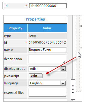 The "id" property is set by default, but it can be used with Javascript code to add additional functionality to the control. For example, click on the grey border on the Dynaform to display the properties of the Dynaform on the left side panel. Click on the "edit" button on the "javascript" property. This will open a JavaScript editor.