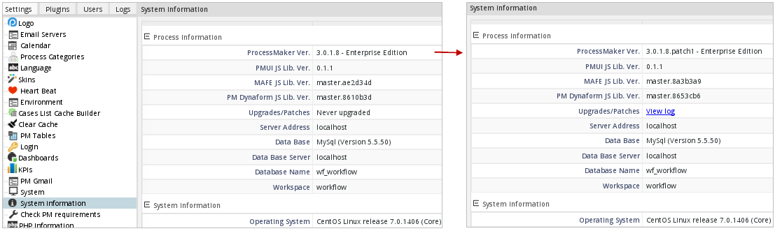 Once finished, log in to ProcessMaker and open the Admin tab, then go to System Information under Settings to see if ProcessMaker has been upgraded. The ProcessMaker version number should now include the number of the Hotfix / Patch installed.