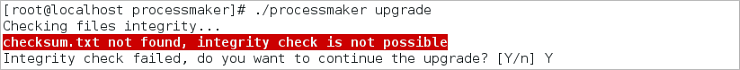 If the integrity check fails, the process will ask the user if he/she wants to continue the upgrade process. Answer "Y" to continue.