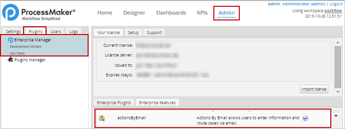 When a case is executed, after configuring the Actions By Email options, all messages sent will be registered on the Actions by Email Log. This is very useful to have a register of which messages were send or which weren't. Login to ProcessMaker with a user such as the "admin", who has the PM_SETUP permission in his/her role. Then, go to ADMIN > Plugins and click on Actions by Email option: