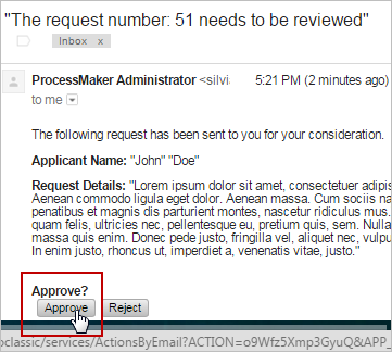 Users who receive the email can use these action links to submit their response directly from the email. In case of this example, the supervisor will approve the request by clicking on "Approve"