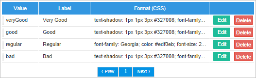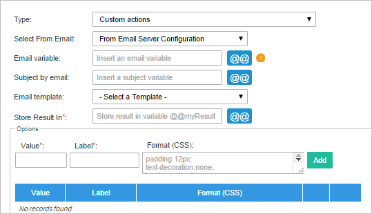 Options: Add in this section the options that will be sent in the email to the users who will receive it, and select just one of them. Each options added must have its value (which will be stored in the variable selected previously once the users selects one options and sends the response), the label with which each option will be shown to the user and finally, each option can have customized css code so it is easier for users to identify each option in the email. For example: