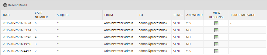 - View Response: by clicking on the icon, the email answered will open in a new window, with the fields which were filled during the process. This have a relation with the field Answered if in that field the Answer is YES, the window will display the message that will be the form filled or the link option.