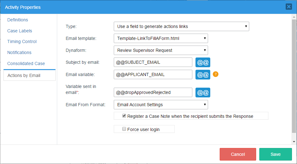 - Use a field to generate actions links: The user will be able to approve or reject the information sent via email. It routes the case onto the next task depending on the link which the user clicked in the email.