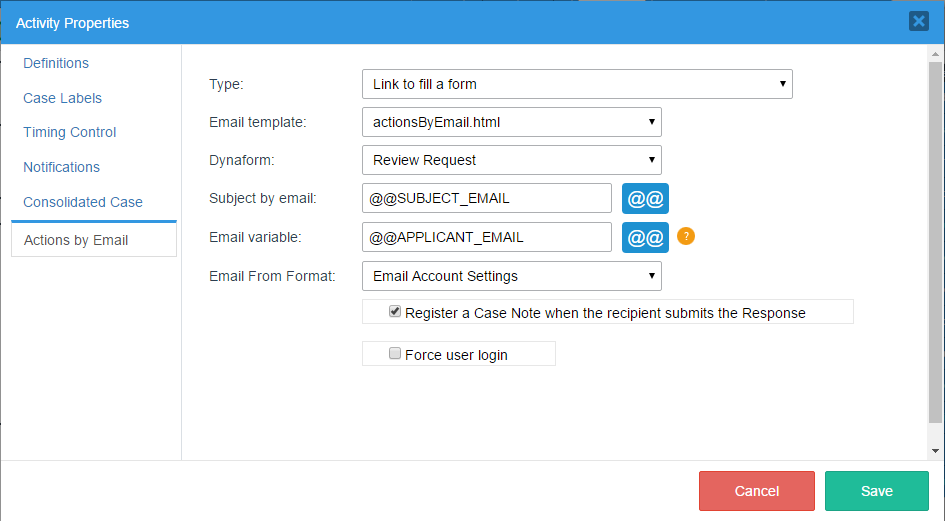 - Link to fill a form: A link to a form is sent to the user's email. When the user submits the form, it saves any data entered into the form and routes the case to the next task in the process.