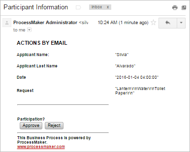 Actions by Email is a feature available on ProcessMaker Enterprise Edition. This feature allows users to receive an email where they can send information to ProcessMaker cases and also route those cases onto the next task in the process. The email can contain a link to a form stored on the ProcessMaker server to be filled out and submitted, a group of links which can be clicked to accept or reject information in the email, or multiple different options customized by the designer. Actions by Email was originally created to allow people - who are not registered users in ProcessMaker -to work on cases, but it can also be used by registered users who wish to work on cases without having to log into the ProcessMaker interface.