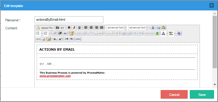- Email Template: Select the template file which will be used as the content of the email. Actions By Email includes a default template file named actionsByEmail.html which can be used for testing purposes. To learn how to create an email template, see this documentation.