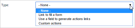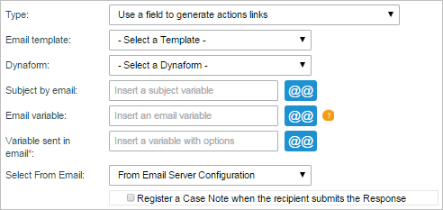 - Variable Sent in Email: This option is available only if the option Use a field to generate actions link is selected. Select the variable that will be sent on the email and that will hold the value of the option selected by the user in the email. It only works for the following fields: dropdown, radiogroup and checkbox.