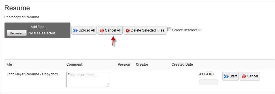If a file needs to be canceled not only when it is listed in the interface but also while it is uploading, click on its corresponding Cancel option placed in the last column, it will immediately eliminate the file from the list.