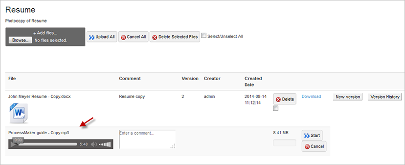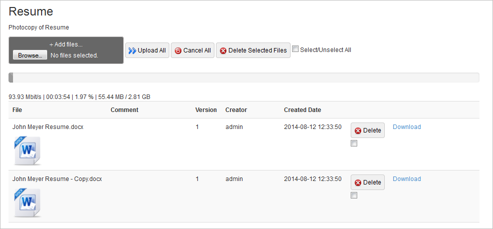 The Multiple Input Document Uploader is a plugin designed to upload one or more documents at the same time by using a user-friendly interface. When the plugin is enabled, a new interface is used for uploading, adding comments and deleting multiple files at the same time. When a file is uploaded as an Input Document, a progress bar is displayed to show what percentage of the file has been uploaded. The interface provides a preview of image files, as well as buttons to delete or cancel the upload of multiple documents at the same time.