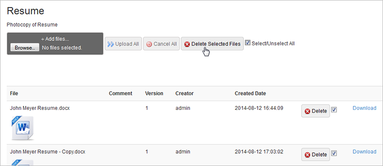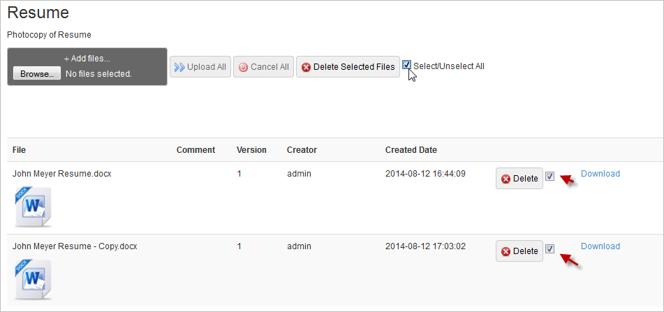 Multiple files can be deleted at a time, by marking the "Select/Unselect all" checkbox to select the files: