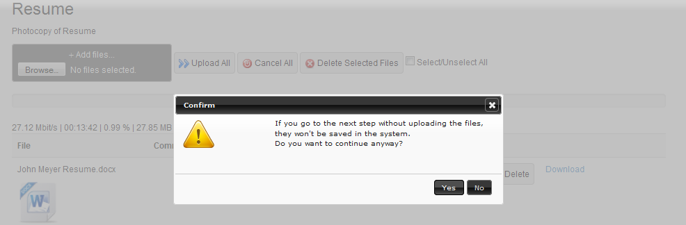 Selecting Yes will cancel the upload, deleting the selected files from the list. If the No option is selected, the files will continue uploading.