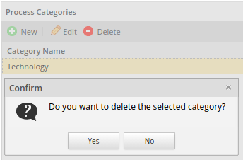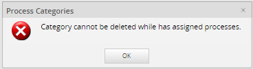 Take into consideration that while a Category is assigned into a process it can't be deleted and therefore will display the following message: