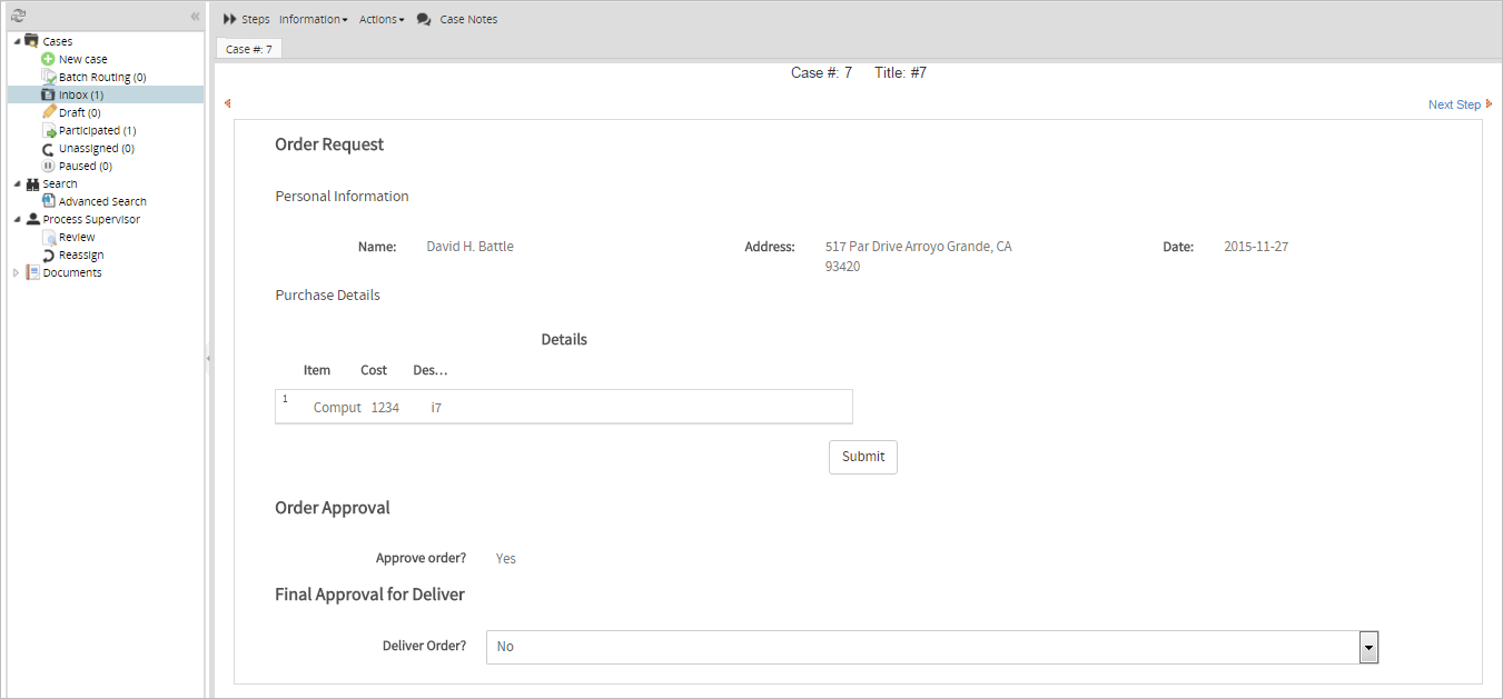 To edit the data in a Dynaform or the list of files in a Input Document, click on it to open it for editing. When done editing a Dynaform's data, click on its submit button to save it. Note that no Next Step link is available when filling in Dynaforms as the Process Supervisor, so add submit buttons to all Dynaforms whose data needs to be edited by a Process Supervisor.