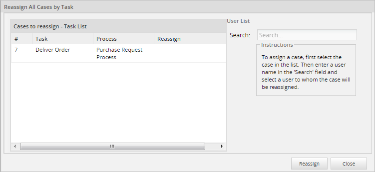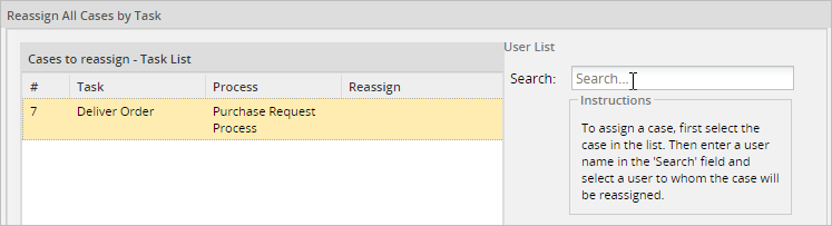 To assign a case select it from the Case to reassign - Task List and in the User List part the Search option will become available.