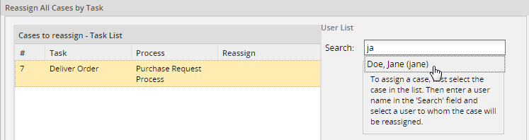 Choose a user who will have the authority to work on the case once this is reassigned. Remember that only users assigned to a case or ad hoc users will be listed in the search option when reassigning a case. For this example the case will be reassigned to the user Doe, Jane (jane).