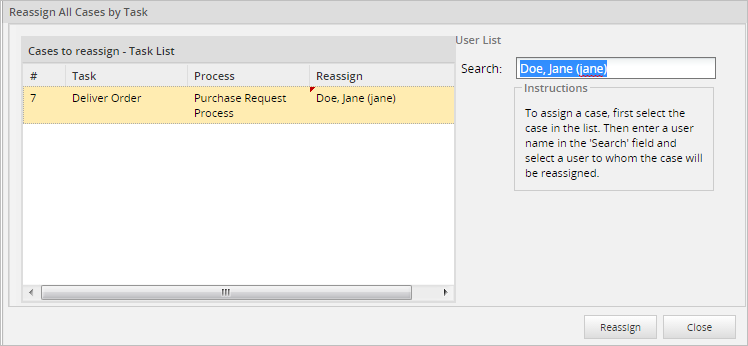 A new window will open where the case chosen can be reassigned. This window is the Reassign All Cases by Task window.