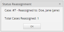 The Status Reassignment window will be displayed where the case number and the person who was assigned to this case will be shown. Click on the OK button to close this window. Logout as the admin and login as Doe, Jane (jane).