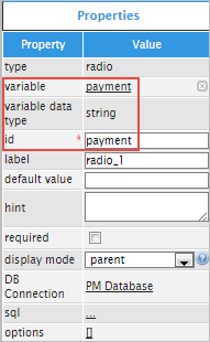 DB Connection For a radio control, if needing to store a value retrieved from a database, select from the dropdown of this property the database connection that will be used (the connection must be already created in the process, check this section to learn more about it).
