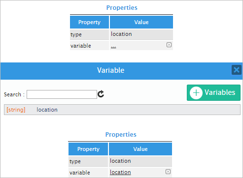 As seen in the image below, the first property is type, which only shows the type of control, in this case "location". The next property is variable; as mentioned in the overview, a variable must be created beforehand. Clicking on the ellipsis ... will open a new window listing all previously created variables. Choose the "location" variable.