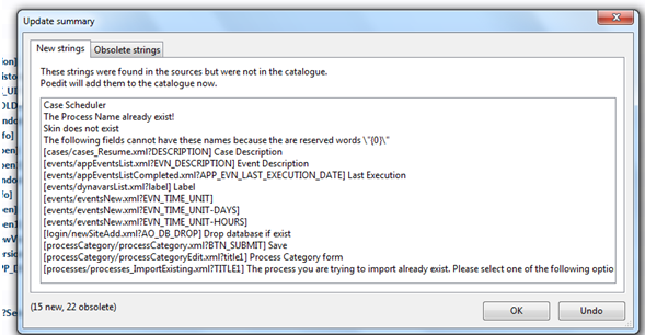 ProcessMaker gives users the possibility to merge languages automatically, meaning that if for some reason IDs or new labels were added to the English language file, the new IDs or labels will be added, in English, to another language's .po file.