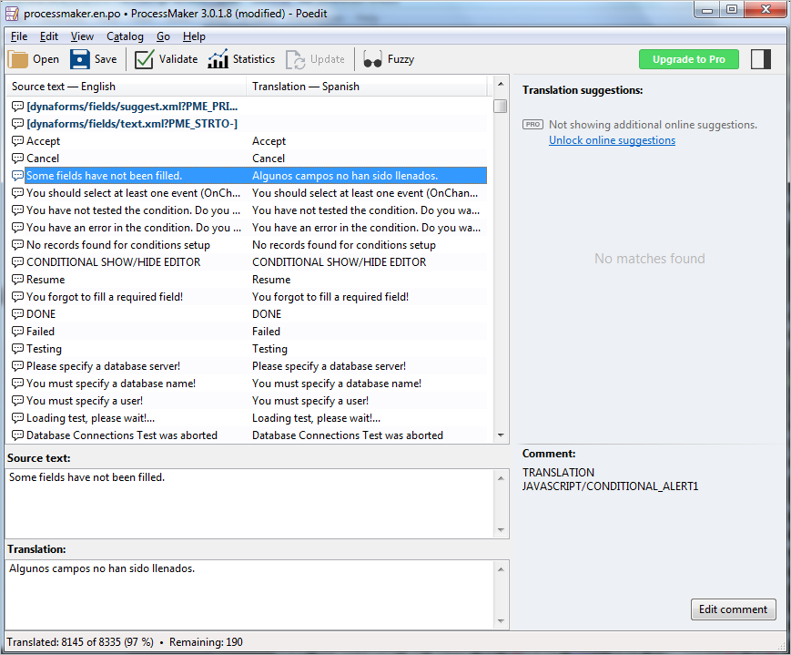 - It is good practice to translate in small sections, then save the file and upload it to ProcessMaker to check errors that may appear.