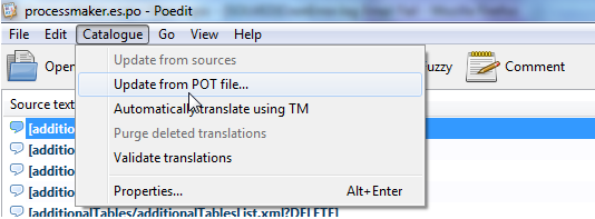3. Open Poedit and open the file to be translated, then go to CATALOGUE> Update From POT File: