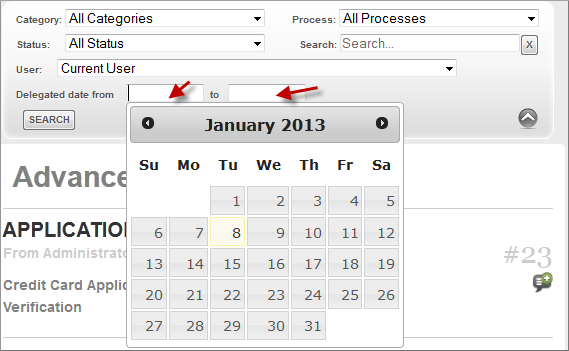 To choose dates to be searched, click on the textbox next to the respective field and a calendar will be displayed: