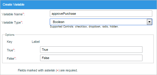 • Boolean: Accepts only values of TRUE or FALSE to represent boolean logic. Any other values will be converted to TRUE or FALSE. All numbers except 0 (zero) and all strings except empty strings are considered TRUE. It is recommended to use these variables with checkboxes, dropdowns or radio buttons which only allow a binary choice (such as Yes/No, On/Off or Approve/Disapprove).